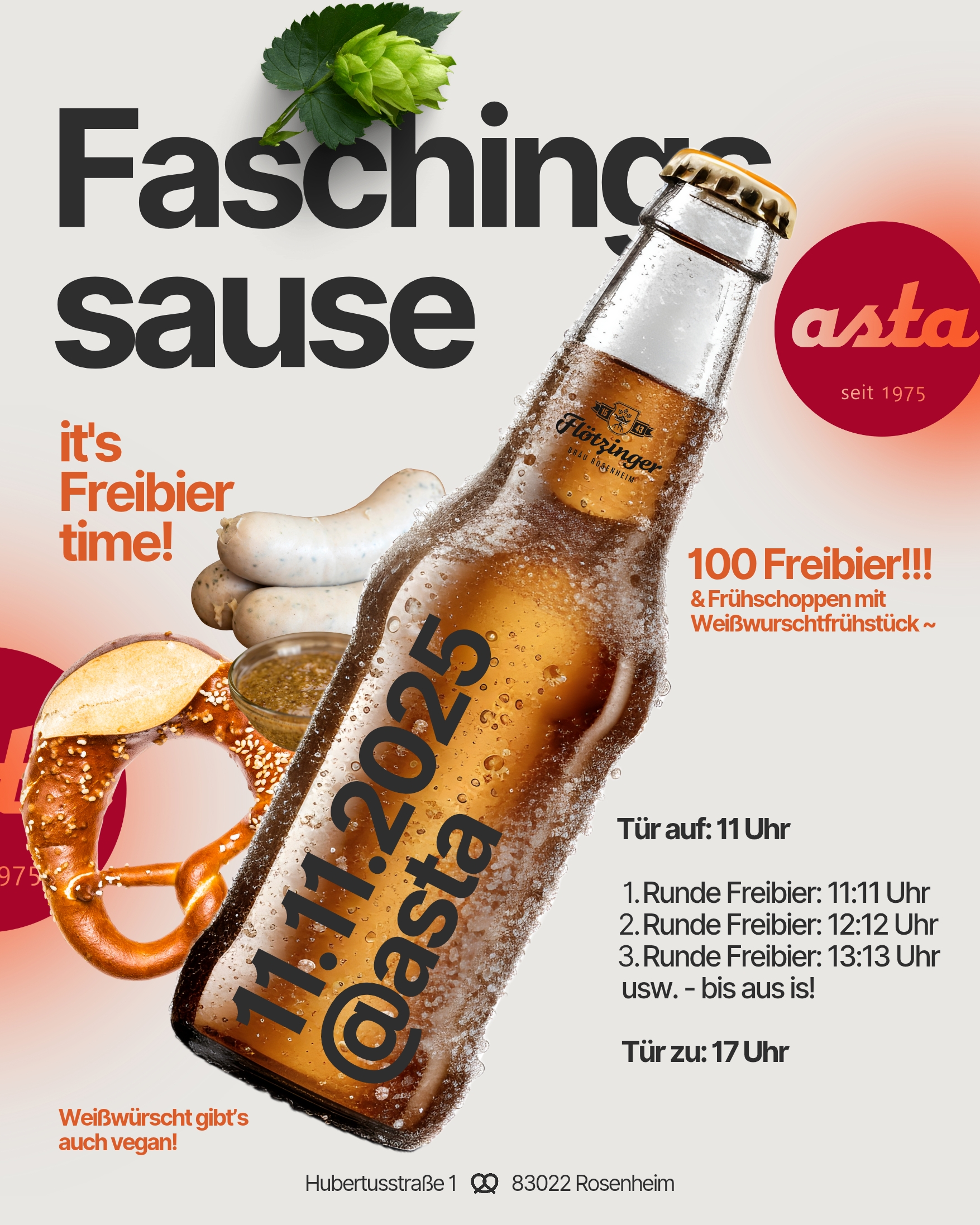 Wie jedes Jahr öffnet die asta am 11.11. um 11 Uhr ihre Pforten für alle, die sich keine Gelegenheit auf Freibier entgehen lassen wollen. Freibier gibt’s um 11:11 Uhr, um 12:12, usw… solange der Vorrat reicht!